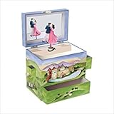 B1031Perfect for baubles, heirloom, and little secrets, this prince and princess music box will delight the face of every little girl. Outside the box are endearing illustrations laminated in a gentle wash of patterns and colors. Inside is a safe home for all those happy memories and personal treasures. Its durable construction will last a long time with much entertainment. Features: -Treasure box comes with music and figurine -Music selection is "Invitation to the Dance" -Solid hardwood construction -Inside material is made of flocked paper which feels like velvet -Promises durability for many years of enjoyment -This tall style is excellent for tiny treasures -Earrings, bracelets, charms and sachets are safe and comfortable inside -Four drawers: one in front, one on each side, and one secret drawer in the back -All graphics are printed on paper and laminated onto the wood -Figurines are painted with paint that is frequently tested -Overall Dimensions: 6" H x 6" W x 4" D Manufacturer Warranty Enchantmints has a 1 year replacement warranty on all their products.