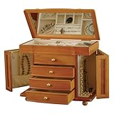 (More customer reviews)This jewelry box is great. It looks well and comes in a carefully packaged box with plenty of foam padding to avoid damage or scratches. The two side pieces for hanging necklaces offer plenty of room, as do the several drawers. For the price, it's a great gift for the significant other!
