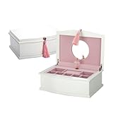 Perfect for the aspiring prima ballerina, this charming pearl white jewelry chest, with its gently curving front and elegant moldings, is accented with a silky, pink and white tassle.A delicate ballerina, reflected in the pink framed round mirror, pirouettes to the magical music of "Nutcracker Suite" when the chest is opened.A lift-out tray is fitted to hold rings, earrings and bracelets and the spacious well accommodates a myriad of treasures, all elegantly lined in a plush, soft pink nylon velvet.Musical key is conveniently located at the back of the chest.Cushioned feet protect furniture.