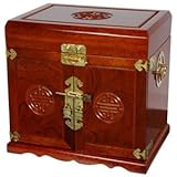 (More customer reviews)I have been looking for a beautiful yet unique chest for my jewelry.This is beautifully done.The cream-colored felt lining is a compliment to the laquered finish in Rosewood.Along with the beautifully carved Asian symbols, the brass fixtures are slightly oxidized, giving this piece an old-world facade.The chest is roomy and organized.It comes with unique locking mechanisms, not pictured in this photo.The chest is quite lovely, a real treasure.