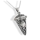 This small cone-shaped box pendant is decorated with celtic knotwork and a crowned heart, a popular symbol from the claddagh.The lid opens to reveal a secret compartment about 1/2" deep and 7/16" wide.Uses include aromatherapy, part of a pendulum, a needed pill, baby teeth, a rolled prayer, or any small keepsake.The included 18" box chain and pendant are crafted of sterling silver.
